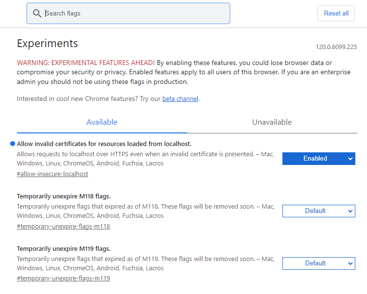to Enable the “Allow invalid certificates for resources loaded from localhost”.