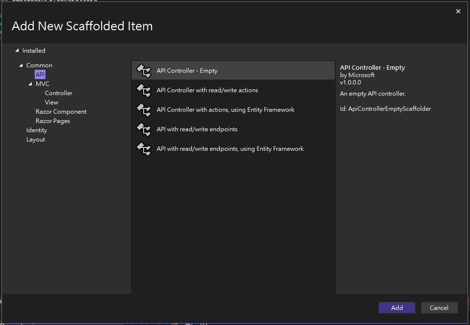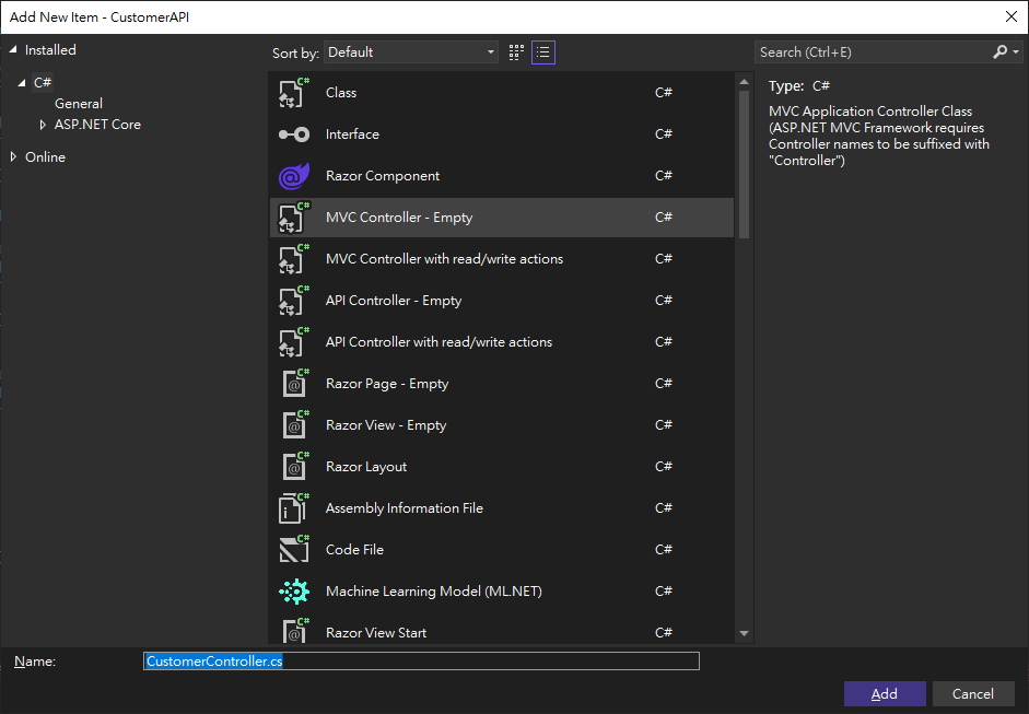 Select “API Controller - Empty” -> rename the file to CustomerController.cs -> click “Add” button