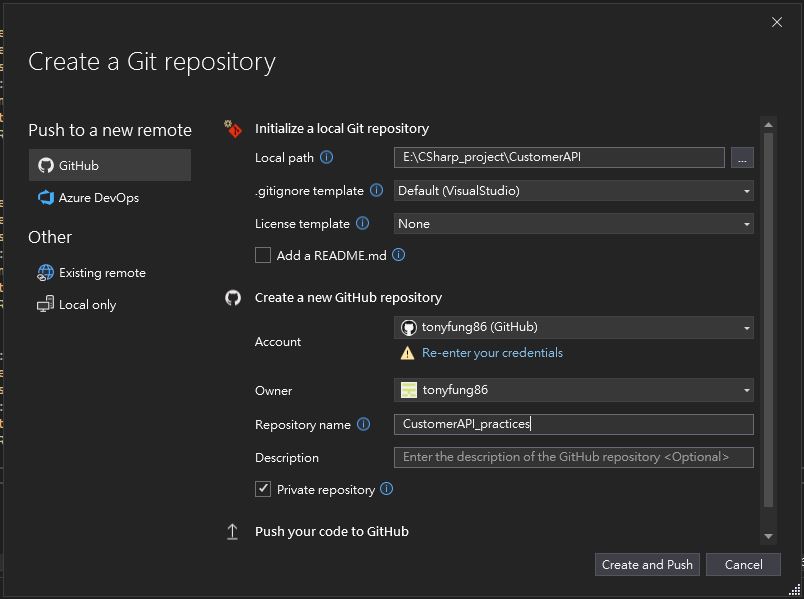-> login GitHub account -> click “Create and Push” button