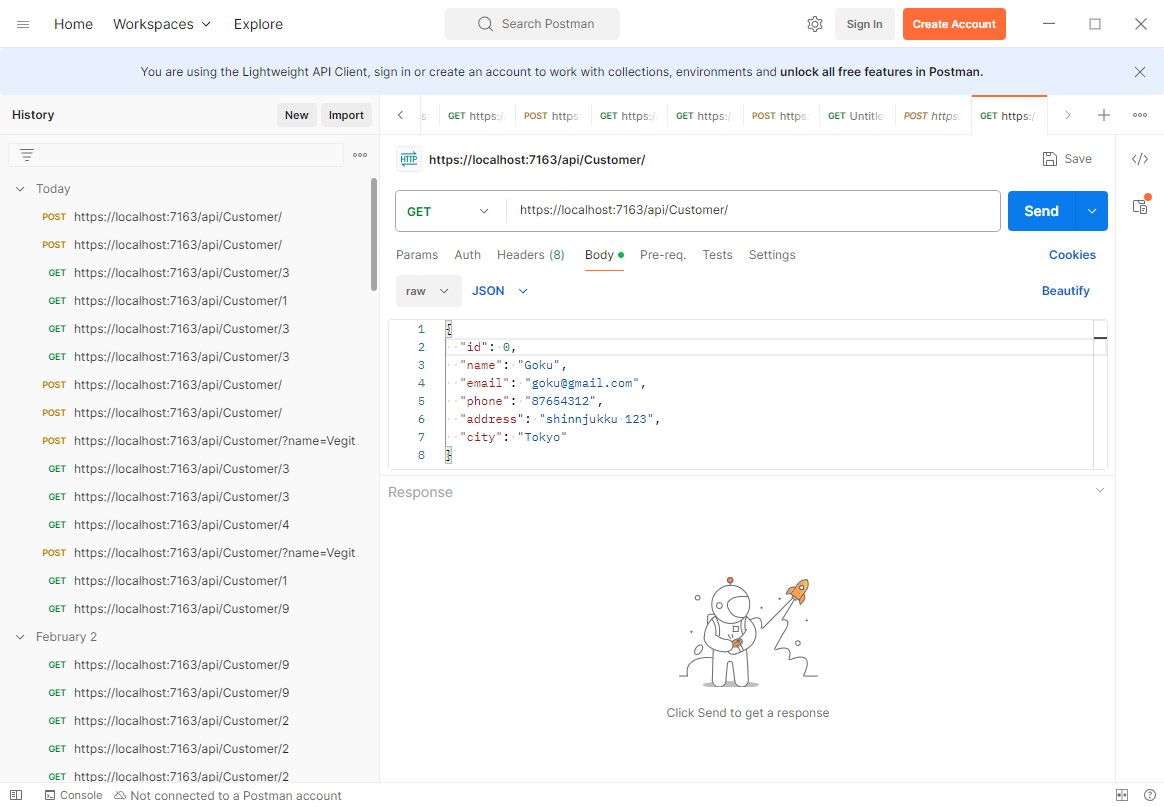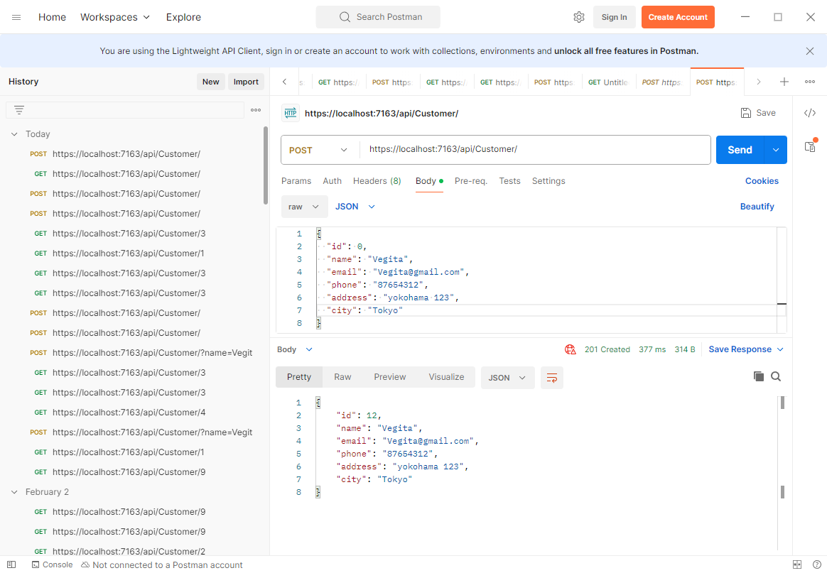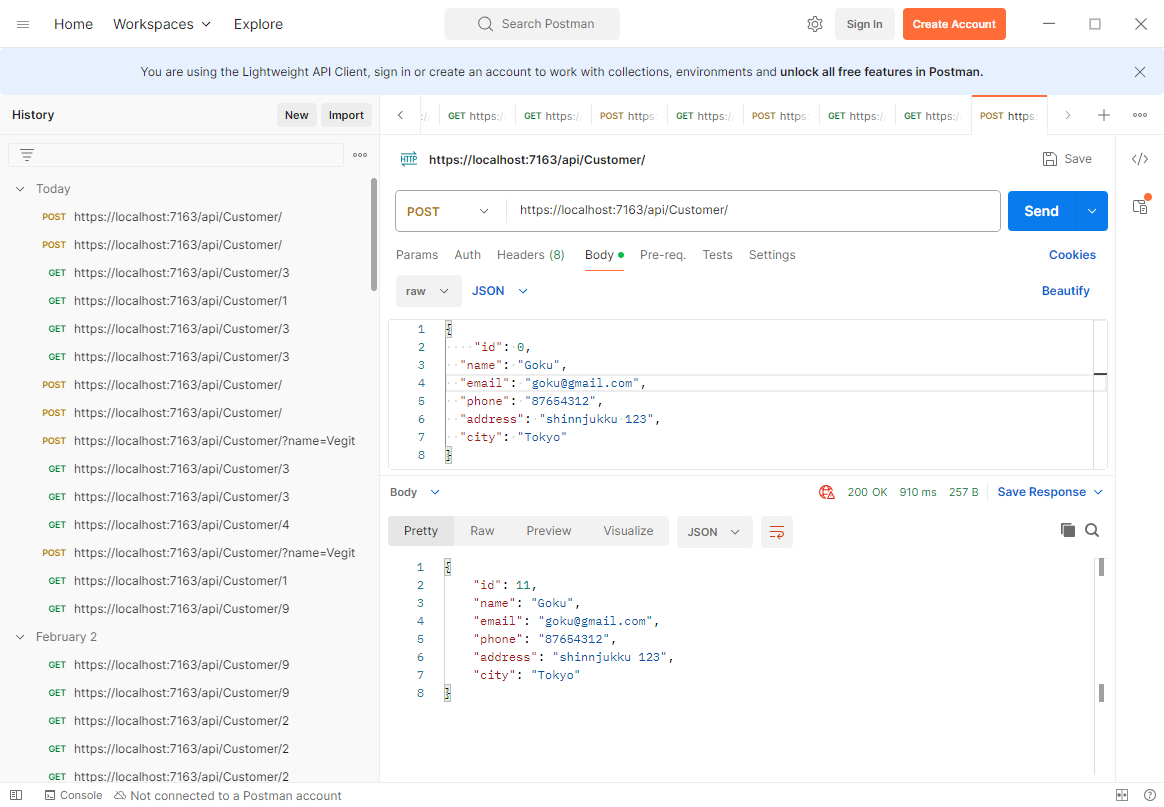 In above code, it retrieve a customer json object from Request body and return 200 status with that customer json object.